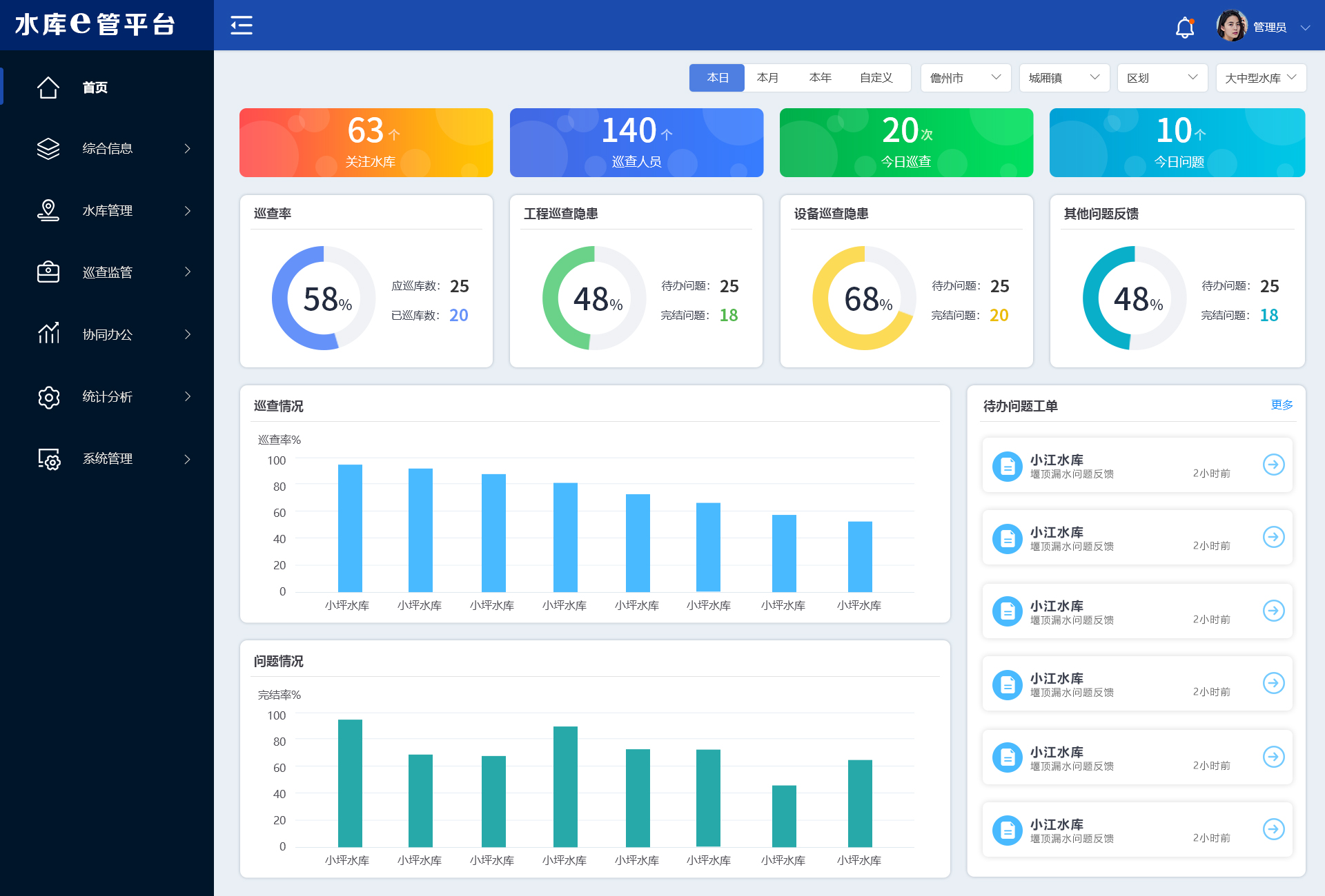 5、全業(yè)務數(shù)據(jù)統(tǒng)計分析,多維度分析水庫巡查管護成效;